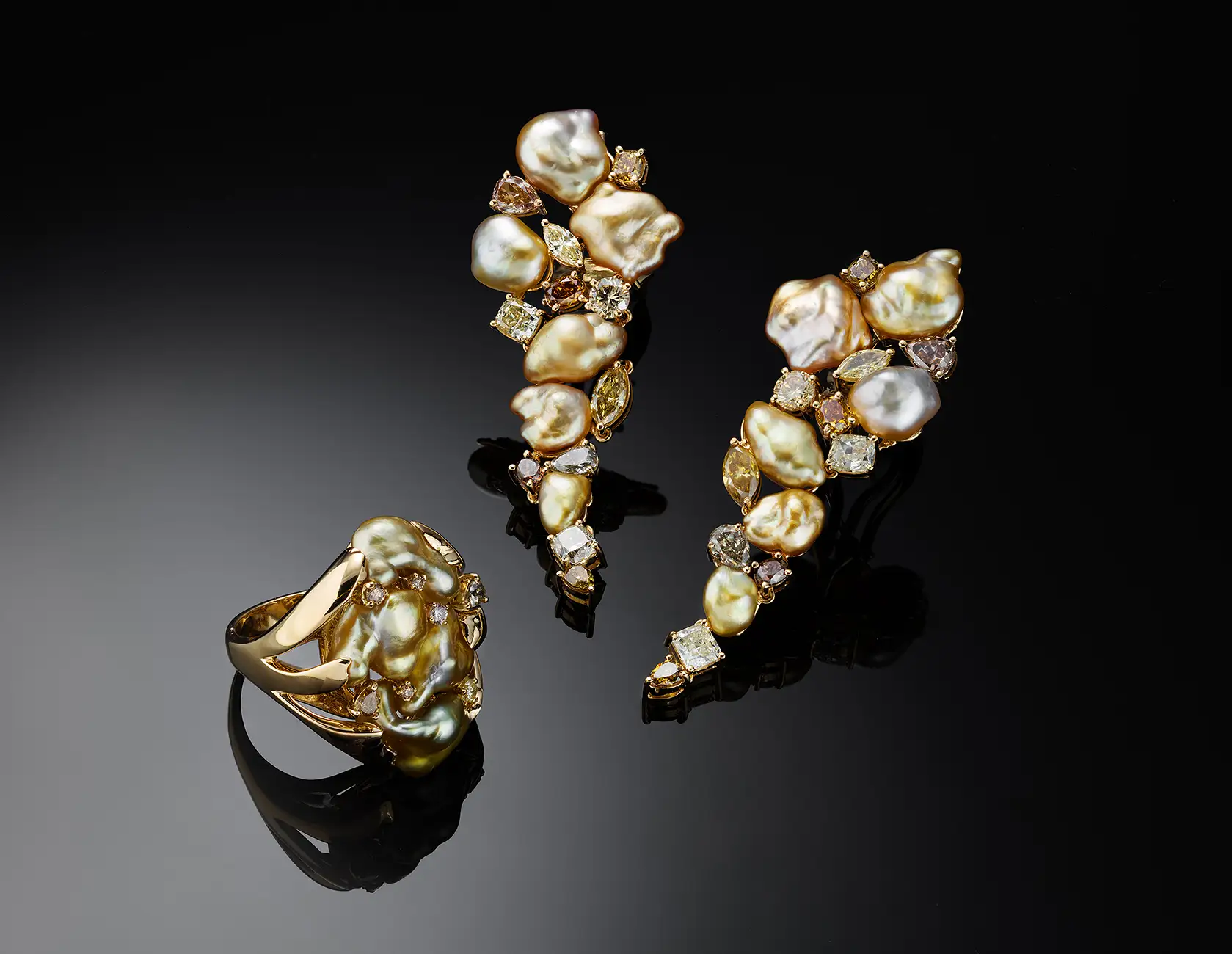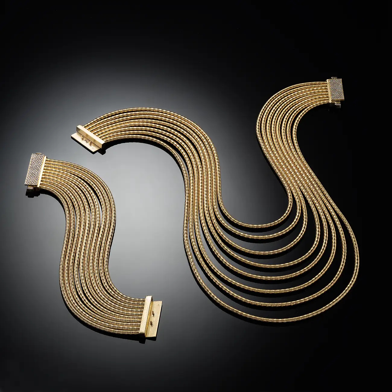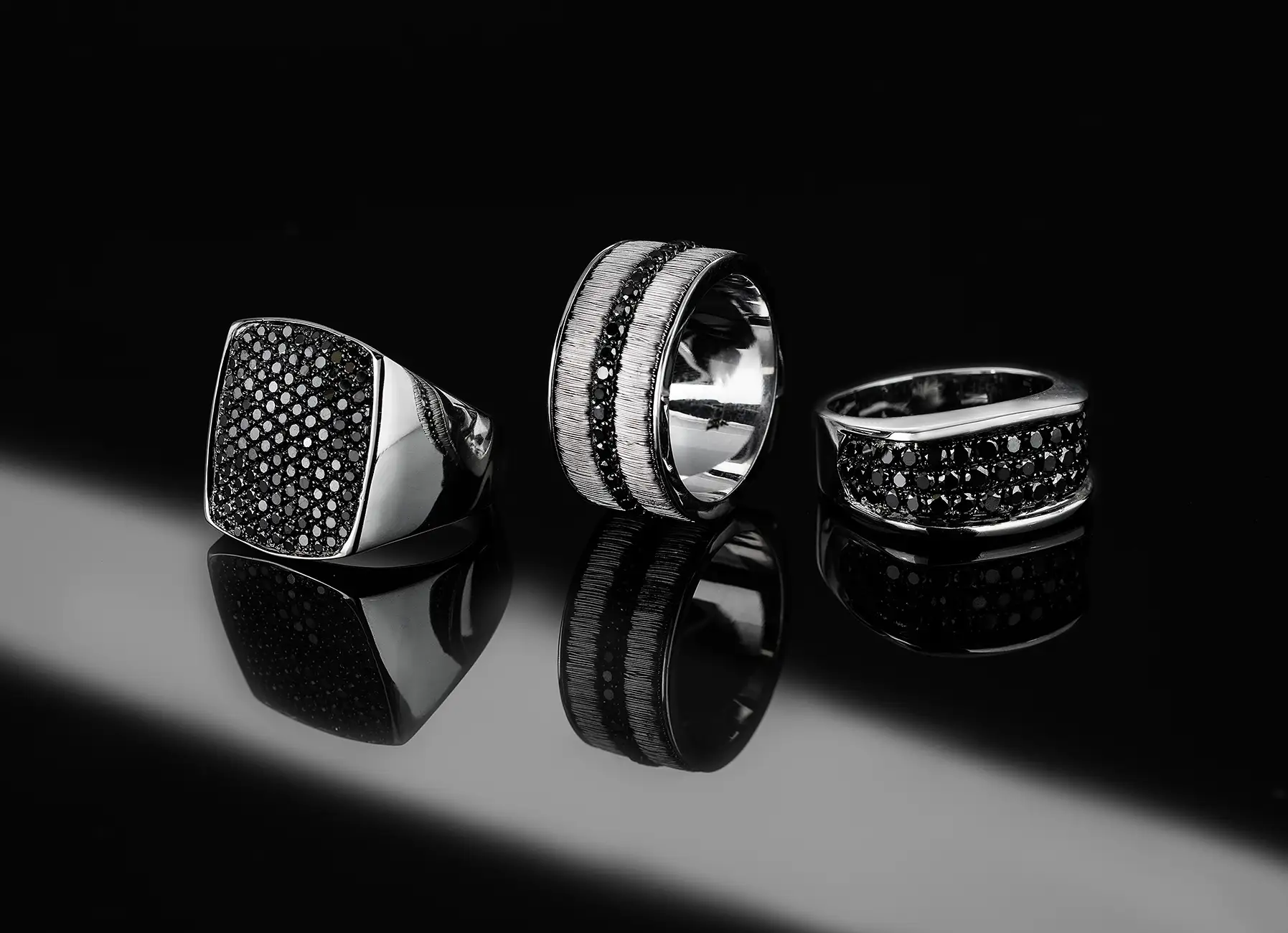 בפרויקט זה בחרנו לצלם סטים של תכשיטי יוקרה על רקע שחור עם השתקפות, המדמה מראה שחורה עמוקה.